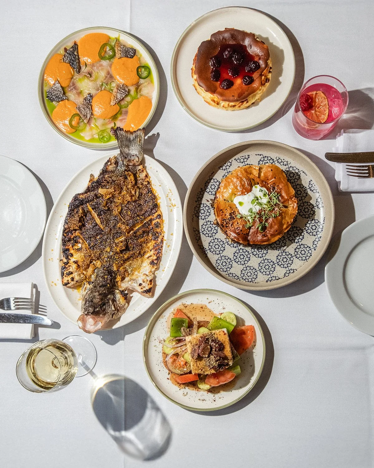 Sample Menus FOOD DESSERTS COCKTAILS WINES Nibbles Smoked almonds · 4.5 Crunchy, lightly smoked almonds - the perfect nibble to start with a drink. Olives · 4.5 A mix of marinated olives, briny and fresh, simple and classic. Small Plates Chorizo and halloumi croquettes (3 pieces) · 10.5 Golden croquettes filled with smoky chorizo and salty halloumi. Padron peppers with piment d’Espelette (gf, df) · 9 Charred padron peppers tossed with a gentle Basque chilli for a touch of heat. Pan con tomate – sourdough served with fresh tomato and oil (v+) · 6 Crisp sourdough rubbed with ripe tomato, a drizzle of olive oil, and a touch of sea salt. Prawns cooked in garlic and chilli oil (gf, df) · 16 Juicy prawns sizzling in garlic and chilli-infused oil, served piping hot from the pan. Gorgonzola Mussels (GF) · 10 Fresh mussels finished in a bold and velvety gorgonzola sauce. The Grill Seabass fillet with Baba Ganoush sauce (gf, df) · 18 Pan-seared seabass on a smoky aubergine Baba Ganoush, light and full of flavour. Grilled Chicken Skewers with Tamarind & Spring Onion (GF) · 9 Chargrilled chicken skewers glazed with tangy tamarind and topped with fresh spring onion. Grilled Vegetable Skewers with Mojo Rojo (V+, GF, DF) · 9 Chargrilled seasonal vegetables served with a smoky, spiced Canarian red pepper sauce. Deconstructed lamb / chicken gyros with flatbread, chips, chilli and tzatziki dips, onion & tomato salad (df) · 24 / 26 A modern twist on the Greek street-food classic: tender lamb or chicken with warm flatbread, chips, fresh salad, and dips to build your own gyros. Salads & Sides Watermelon with feta and pomegranate salad (gf, opt df) · 10 Sweet watermelon with salty feta, fresh mint, and a scatter of pomegranate seeds. Pyrá Greek salad (v, gf, vo) · 12 A fresh mix of tomatoes, cucumber, olives and feta, with oregano and olive oil. Oregano fries served with crumbled feta and feta dip (v, gf) · 7 Crispy fries dusted with oregano, served on a creamy whipped feta dip. DESSERTS Scoop of sorbet: chocolate, raspberry (v+) · 3 A refreshing finish - choose between rich chocolate or tart raspberry sorbet. Basque cheesecake with strawberries and pistachios (v) · 9 Burnt Basque-style cheesecake, creamy and caramelised, served with fresh strawberries and pistachios. Baklava with hazelnuts and chocolate sauce (v) · 9 Layers of flaky pastry and hazelnuts, drizzled with warm chocolate sauce. COCKTAILS Pyrá Margarita · 13 el jimador blanco tequila. lemon. yuzu. agave Prosecco cocktails · 10 (mango, passion fruit, peach or strawberry) El Matador · 13 el jimador blanco tequila. mezcal. lime. pineapple Watermelon Daiquiri · 13 havana rum. watermelon. lime Pyrá Bramble · 13 blackberry. gin. lime. apple juice Kalimotxo · 13 tempranillo. coke Espresso Martini · 13 coffee. kahlua. sugar. vodka Greek Sidecar · 13 metaxa. cointreau. lemon Mocktails Pyrá Eidikos · 8 elderflower. ginger ale. lemon juice Fresa Maria · 8 strawberry. ginger ale. lemonade. lime Beers Mahou half pint · 6 Mahou shonner · 7 Crispy apple cider shonner · 7 Crispy apple cider half pint · 6 Mahou (330ml) - Spain · 6 Mythos (330ml) - Greek · 6 Punk IPA (330ml) – British · 6 Peroni (330ml) - Italy · 6 Peroni 0% (330ml) - Italy · 6 Spirits HOUSE (50ml) & Mixer · 12.5 el jimador, stoli, beefeater, havana PREMIUM (50ml) & Mixer · 12.5 casamigoes, grey goose, hennesey *spirit prices will vary depending on the quality chosen* White Wine La Vivienda Blanco · 26 a zesty wine with lemon and lime flavours Casa Del Arco Blanco · 32 easy drinking, aromatic dry white wine Castillo del Moro Airen Sauvignon Blanc · 35 crisp white with citrus characteristics Domaine Papagiannakos Assyrtiko · 52 aromas of citrus, white blossom, mandarin and lime Clos Montblanc Castell Chardonnay · 40 fresh with crisp acidity Finca Manzanos Rioja Blanco · 49 rounded, long and pleasant on the palate Chablis 1er cru · 70 floral and mineral aromas with citrus fruit flavours and a long finish Red Wine La Vivienda Tinto · 26 rich plum, dark fruits and spice Castillo del Moro Tempranillo Syrah · 36 light, harmonic and well rounded Casa Del Arco Tinto · 40 ripe red fruits and light tannins ‘Belleruche’ Cotes du Rhone · 44 fruit-forward with notes of ripe black cherry Sierra Grande Merlot · 47 fresh and fruity Domaine Papagiannakos Erythros · 52 ripe dark black and red fruit aromas Finca Crianza Rioja (VG) · 52 red berries and medium body Finca Rioja Gran Reserva (VG) · 63 black fruit, vanilla and velvety smooth Châteneuf du pape france · 75 Full - bodied, velvety and powerful wine, with notes of red fruits, plum, hazelnut and spice Rose´ Castillo del Moro Rosado Tempranillo · 26 juicy wild strawberry, raspberry and cranberry fruit Famille Perrin 'Le Triangle D'or' Luberon · 37 opens to aromas of red fruit, peaches, plum and apricots Whispering Angel · 65 apple, pink grapefruit and peach Sparkling Wine Aqualita Prosecco DOC · 40 fresh, dry & well-balanced Champagne, Heidsieck & Co. Monopole 'Gold Top' · 70 Rich, toasty, creamy flavours. Aromatic and citrusy, with a lush texture Champagne, Ruinart, Blanc de Blancs · 135 smooth with a characteristic luminosity The Food