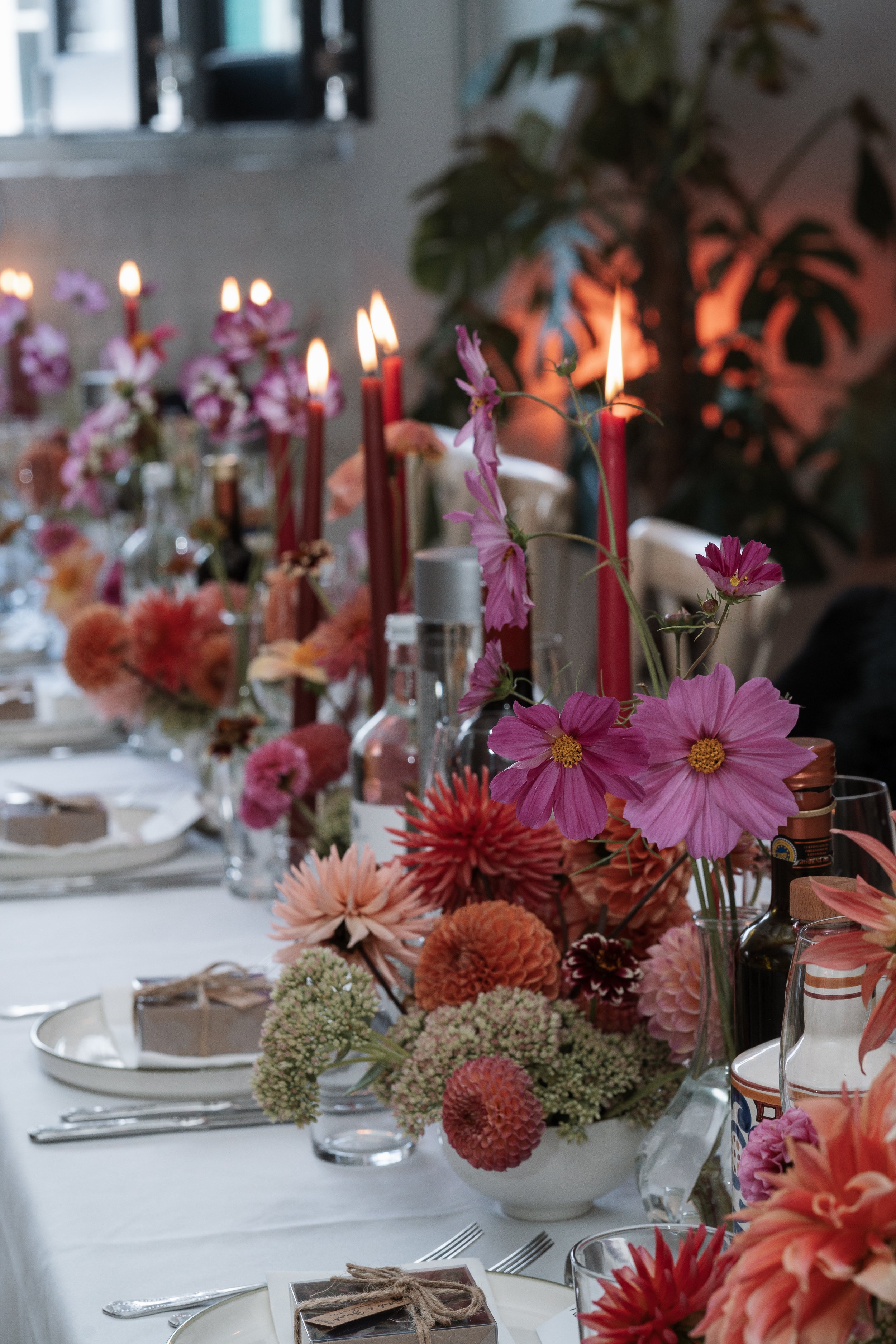 All table linen, tableware and tall taper candles are included. Flowers are an extra charge of £20 per mini bud vase. We can also recommend a florist or you can arrange your own.