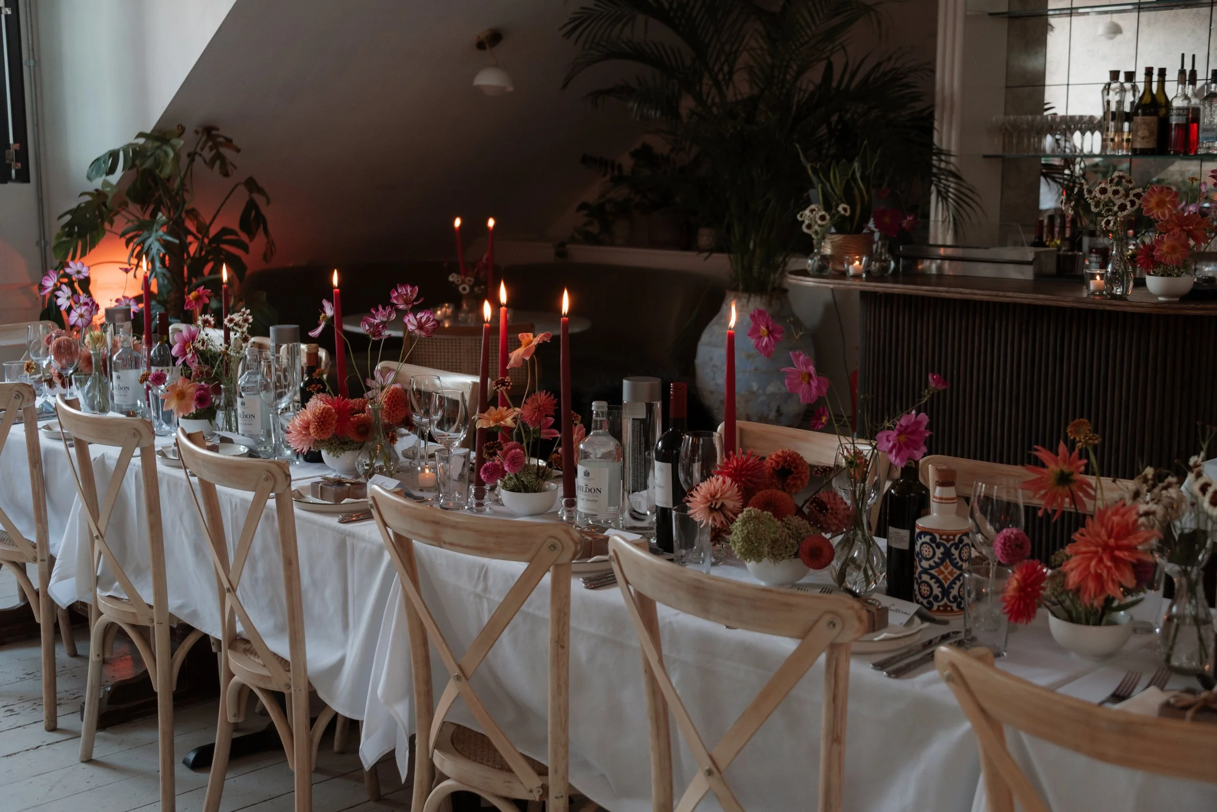 The main room at PYRÁ is located on the ground floor, featuring an open kitchen, bar, and bi-folding doors that open onto the Terrace. The space accommodates up to 40 guests seated or 80 standing. The Terrace seats up to 22 guests (weather permitting).